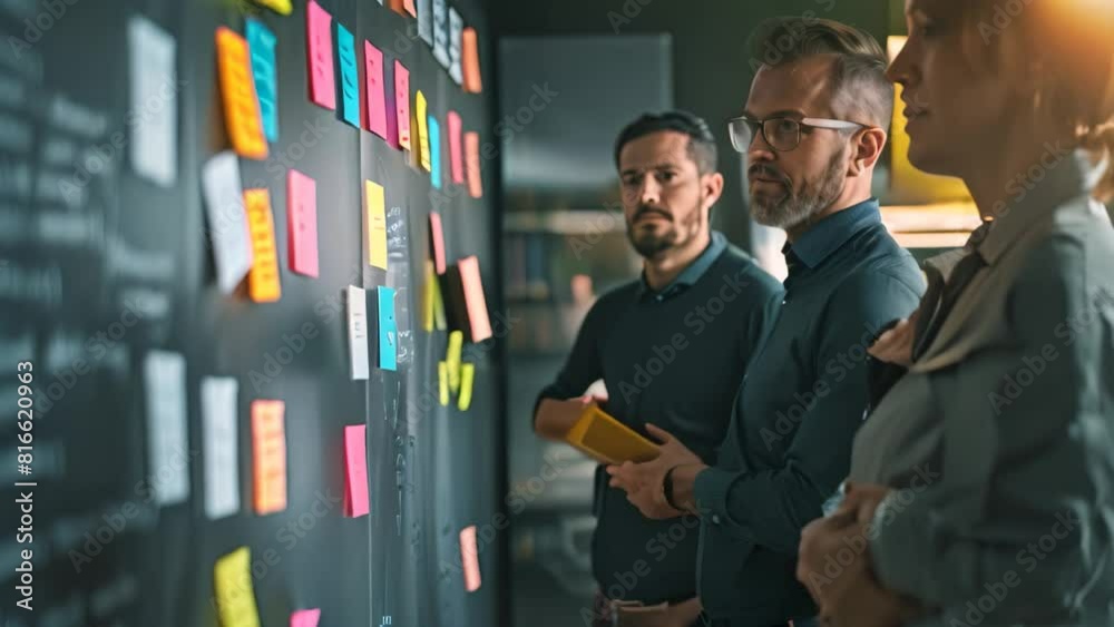 Ondernemers bespreken van ideeën met post-its op een glazen wand