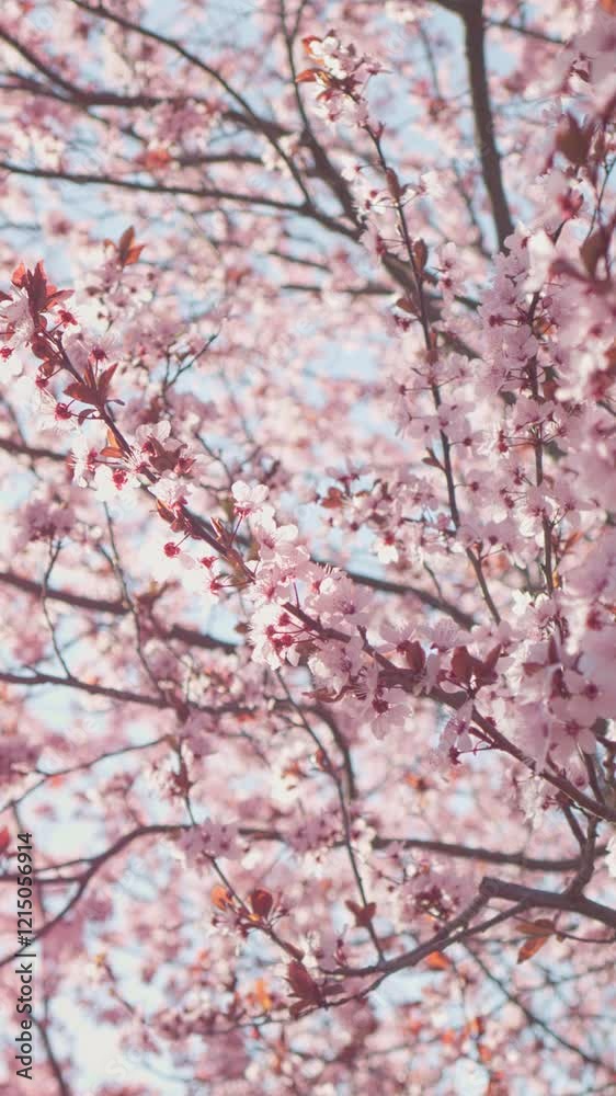 Japanse roze sakuraboom die van de kersenbloesem zich langs de wind op lentetijd bewegen.